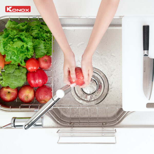 Với model Tari 9051SM, Konox ra mắt công nghệ xử lý bề mặt trơn mịn sở hữu độ bền, khả năng chống ăn mòn lý tưởng, an toàn với sức khỏe và 100% có thể tái chế, giữ vững độ bền và thẩm mỹ theo thời gian. Tari 9051SM với thiết kế bo tròn giúp dễ vệ sinh, đồng thời tạo cảm giác nhẹ nhàng, hài hòa trong tổng thể không gian.