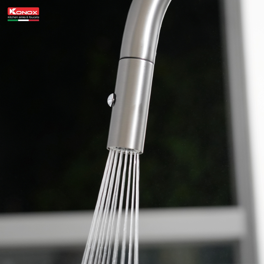 – Chức năng: Nóng lạnh + Rút dây + Đầu vòi khớp xoay + 2 chức năng Sprayer (Dòng chảy phun mưa, tạo bọt khí) + Xoay 360 độ